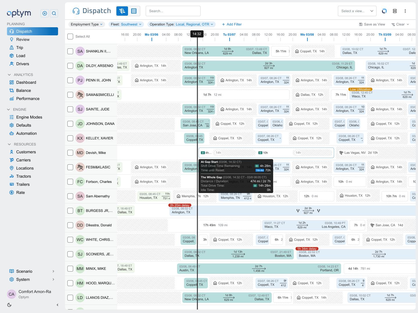 - Reduced Empty Miles: Fill backhauls and balance loads smarter by using live fleet data to match nearby drivers with available hours, boosting revenue per mile.