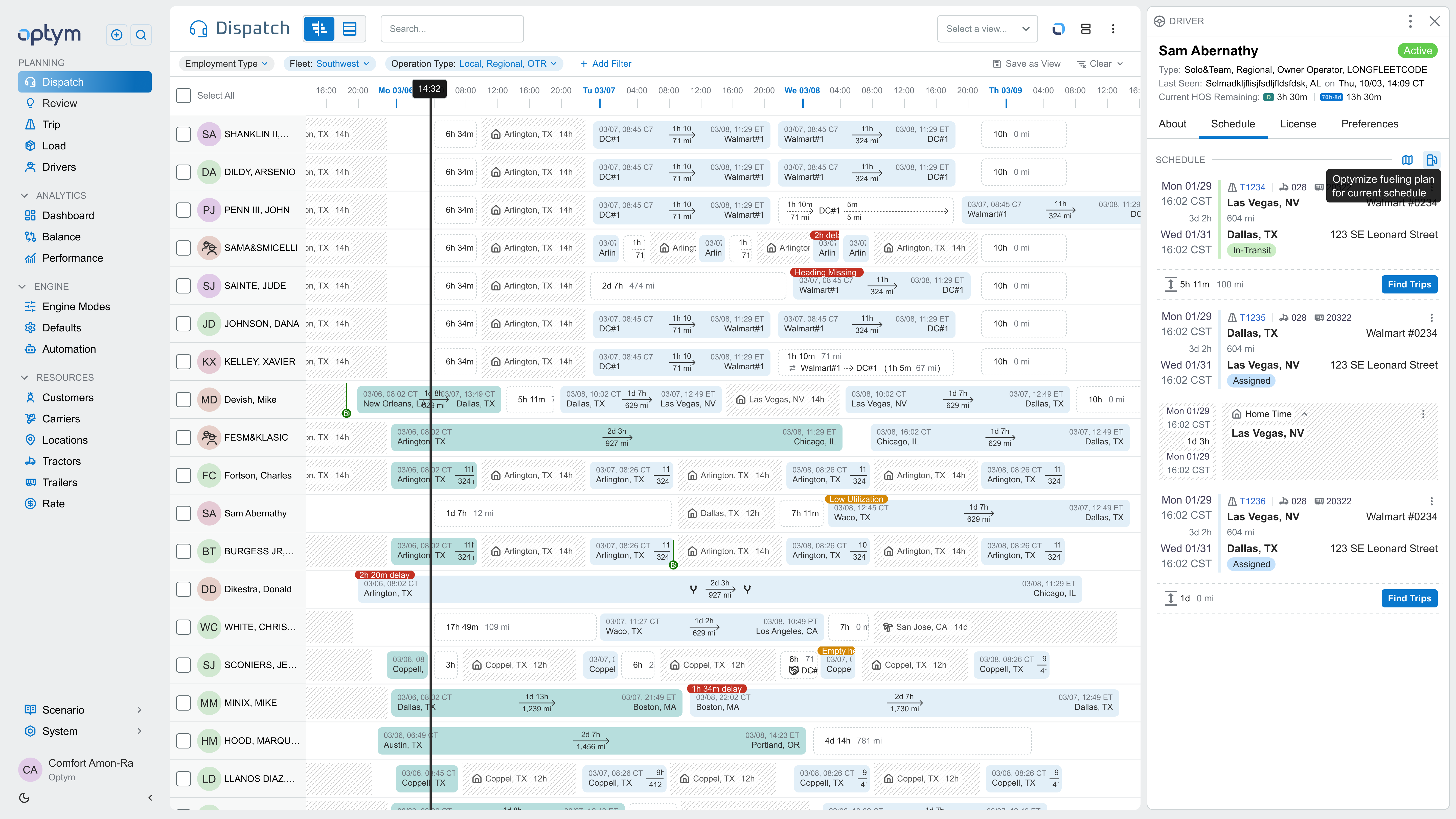 - AI-Powered Load Matching: Instantly see the optimal driver and truck for each load based on current HOS, location, availability, and equipment—saving hours of manual planning.