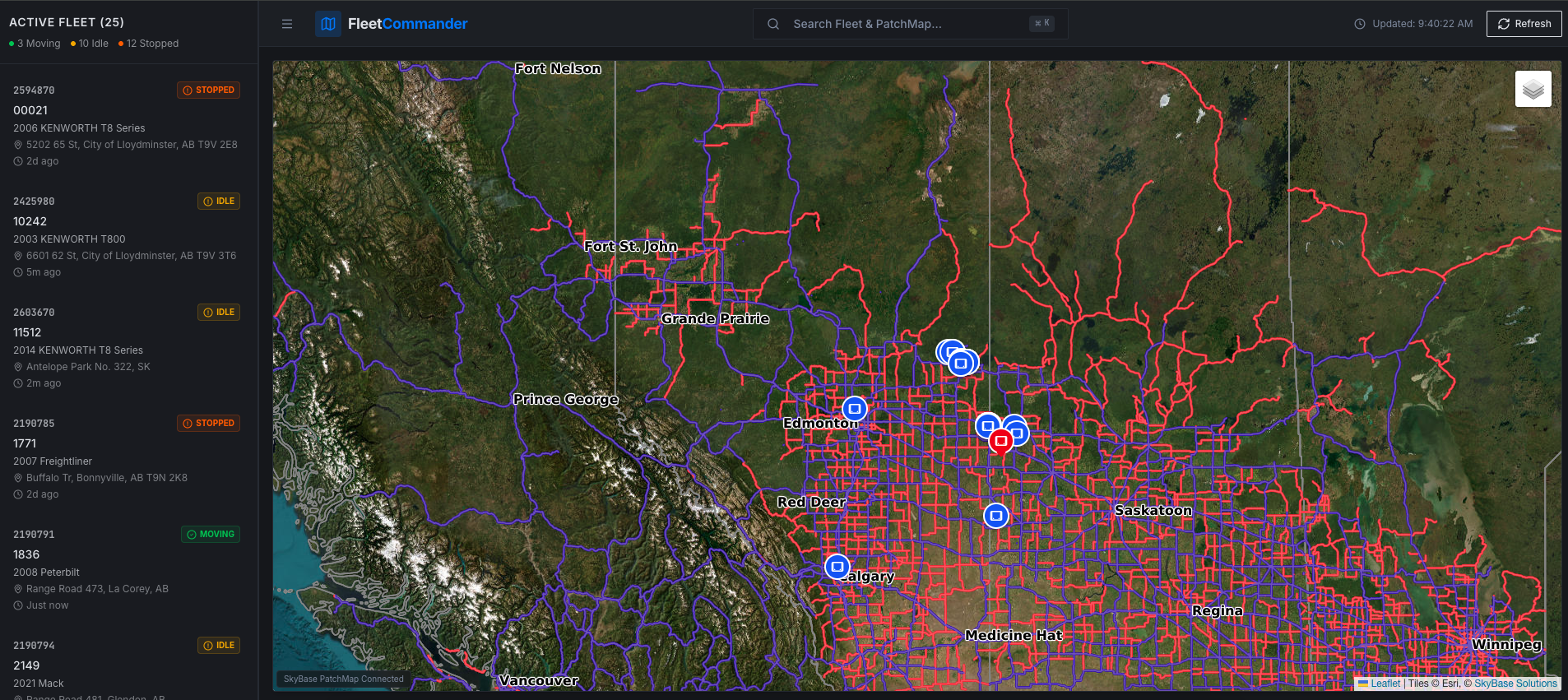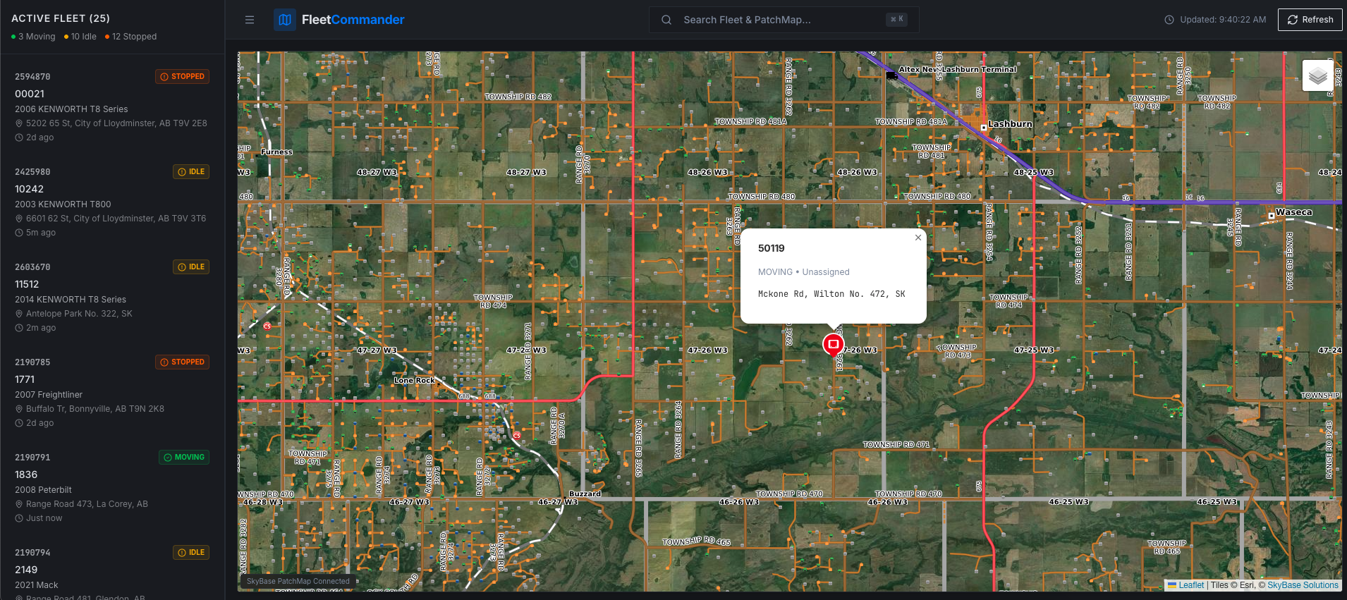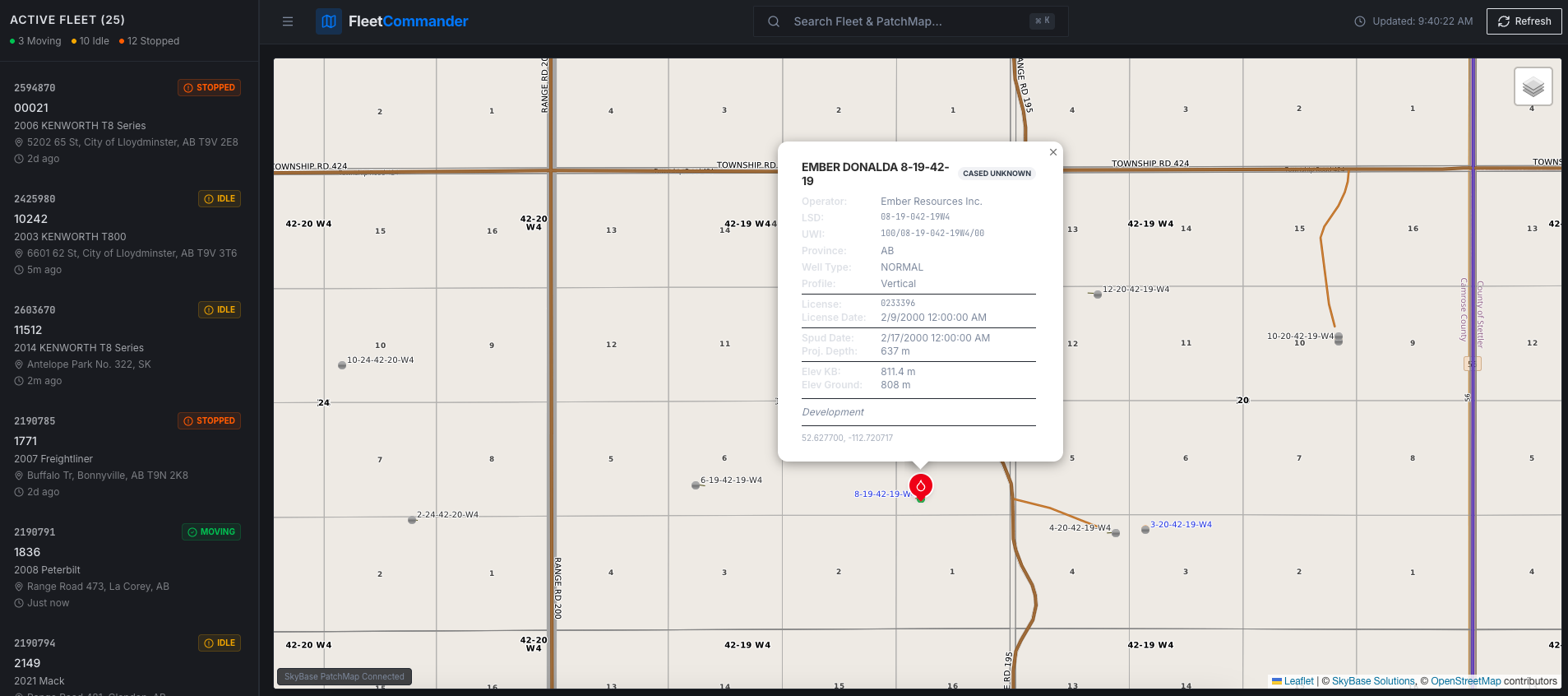 Searchable Well Sites & LSD Layers: Quickly locate and zoom to specific well sites or legal subdivisions while tracking your fleet, making it easier to assign jobs, monitor movements, and respond to field needs.