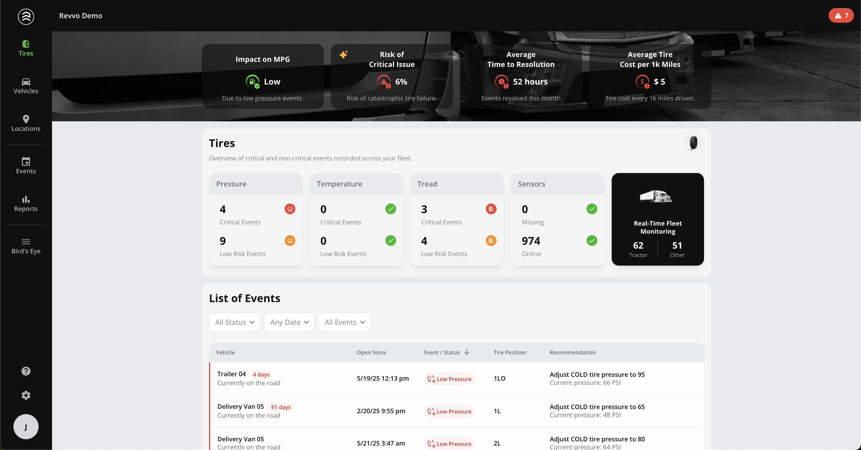 - Tire Reports: Revvo offers Operations teams actionable insights into their tire health on a customizable basis to best suit your operational needs.
